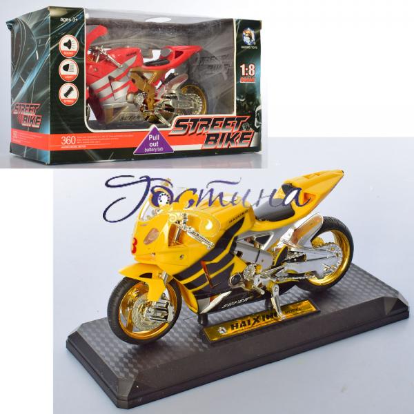 Мотоцикл HX790 20см, на підставці, 1: 8, звук, світло, в кор-ке. Розмір - 26,5-14,5-11см, Матеріал - пластмаса, Тип упаковки - Window Box.