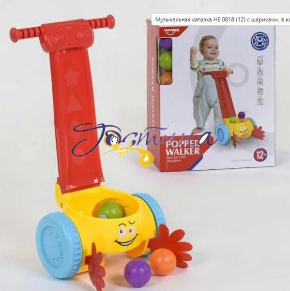 Каталка музична з кульками призначена для малюків, які тільки навчилися ходити. Проста і захоплююча гра, сприяє розвитку координації рухів дитини: малюк котить іграшку, а різнокольорові кульки вистрибують по черзі. Щоб продовжити гру кульки необхідно знову зловити. Руху дитини супроводжують веселі мелодії. Яскраві кольори і забавна мордочка з ручками обов'язково сподобаються дитині. Працює від батарейок (у комплект не входять). Розмір упаковки: 34,5*15*28 см