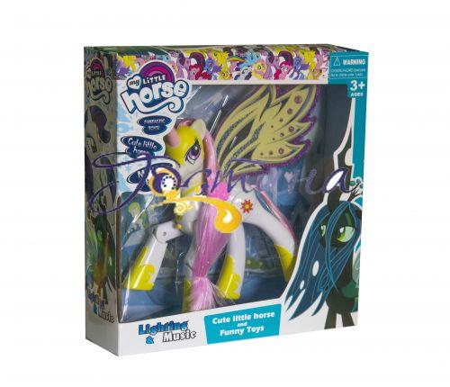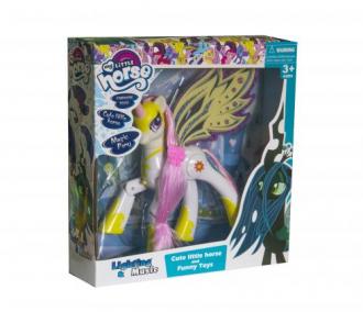 Красива поні з яскравою довгою гривою і блискучими крильцями. Рухливі голова і ноги. На передніх ногах згинаються коліна (на шарнірах). Якщо натиснути на кнопочку - конячка заспіває красиву пісеньку англійською мовою і буде яскраво підсвічуватися.