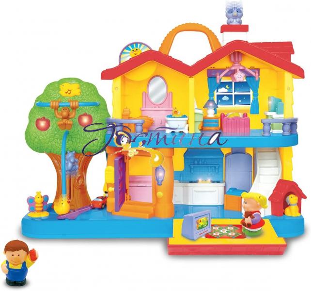 Яскравий розвиваючий ігровий набір Kiddieland 032730 «Заміський будинок» розважить малюка приємними мелодіями, миготливими вогниками і забавними звуками. У наборі фігурки людей, затишний сад і двоповерховий будиночок зі зручною спальнею, зі смаком
