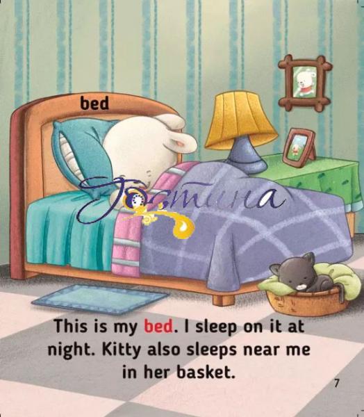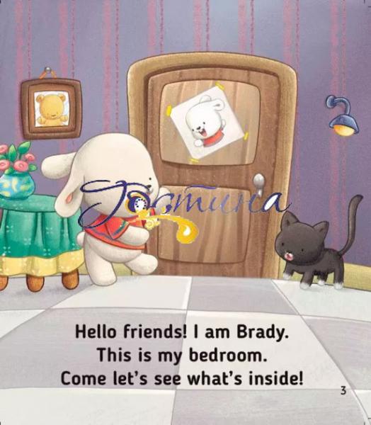 "Моя спальня". Тут Бреді знайомить дітей з предметами, які знаходяться в спальні кролика. Подушка, стіл, будильник, ліжко - ось, скільки нових слів ви вивчіть разом з малюками. Багато уваги в книжечці приділяється саме практичної частини. Купа цікавих завдань, які в ігровій формі допоможуть малюкам закріпити знання.