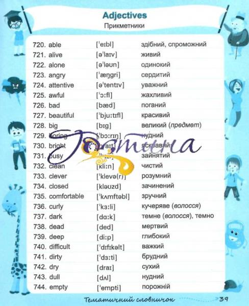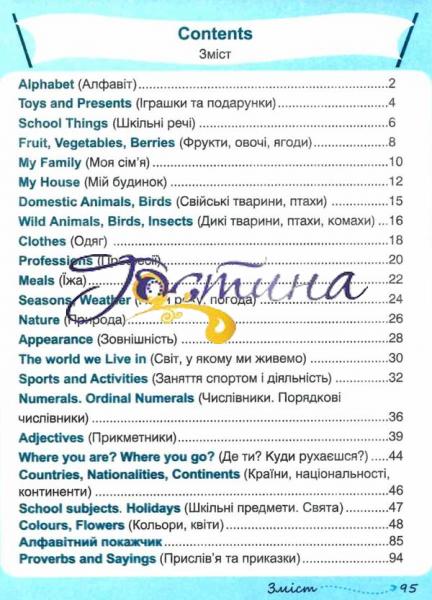 Зошит з друкованою основою призначений для ведення індивідуального словника, до якого учень уписує вивчені англійські слова, їх транскрипцію і переклад українською мовою. Зошит містить тематичний словничок, складений відповідно до чинної програми з англійської мови у початковій школі. Він охоплює передбачений програмою лексичний матеріал, що вивчається у 1-4 класах. Словник допоможе учням у виконанні домашніх завдань, а також стане у пригоді батькам для перевірки знань дітей. Наприкінці зошита міститься алфавітний покажчик. За українським словом легко знайти відповідне слово англійською мовою в тематичному словничку. Наведено прислів'я та приказки, які відповідають тематиці початкової школи.