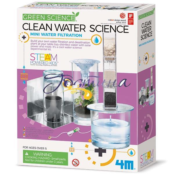 З цим набором можна створити фільтр для води й очистити, наприклад, морську воду від солі.Допоможіть зберегти навколишнє середовище. Навчіться очищати і повторно використовувати брудну воду, проводячи цікаві експерименти з очищення. Створіть свою установку по фільтрації і опріснення води, дезинфікуйте воду за допомогою сонячної енергії.Кожна секція фільтра видаляє частинки забруднення з води, очищаючи її. Різні фільтри збирають частинки різних розмірів. Вода може пройти крізь проміжки між піщинками, але там затримаються інші частинки. Вугільні гранули зроблені з матеріалу, що називається активоване вугілля. Хімічні речовини у воді чіпляються за поверхню матеріалу і відокремлюються від води. Цей процес називається адсорбцією. Фільтрувальний папір має крихітні отвори між волокнами. Вода може текти крізь них, але частинки не пройдуть. Це особливо ефективно при фільтрації масла.Настільний фільтр демонструє принципи роботи очисних споруд, які постачають питну воду в будинки і на виробництва. На заводі з очищення води процес фільтрації більш розгорнутий і масштабний, а в воду також додають хімічні речовини для знезараження.