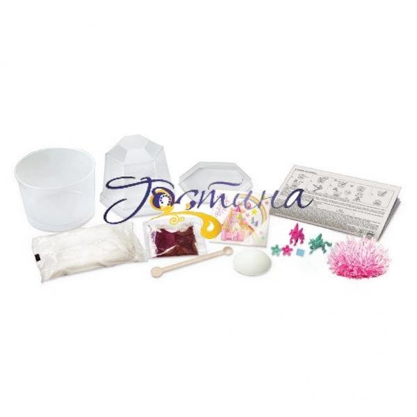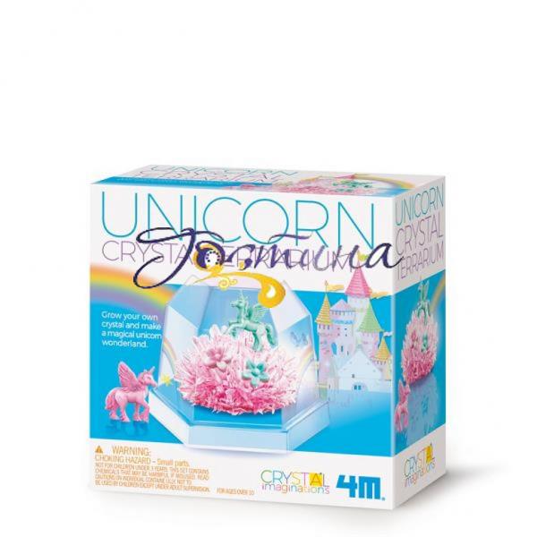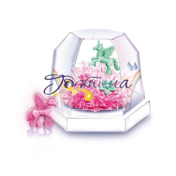 Комплектація: суха суміш для вирощування кристалів, червоний барвник, ложка для перемішування, кришталева основа, клейка стрічка, стакан для приготування суміші, прозорий купол, підставка, наклейки, фігурки єдинорогів.