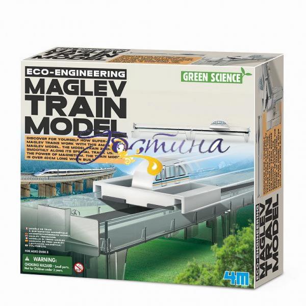 Зберіть модель супершвидкого поїзда і спостерігайте як він ширяє над треком завдяки силі магнетизму.Потяги на магнітній подушці називають маглев, скорочено від магнітної левітації. Будь-який магніт має два полюси: північний і південний. Різні полюси притягуються, а однакові – відштовхуються. У моделі поїзда використовуються магнітні стрічки. Магніти на поїзді і на треку розташовані так, щоб однакові полюси були звернені один до одного і відштовхувалися. Так поїзд утримується в повітрі.Магнітоплан не виробляє шуму, тому що не торкається поверхні рейки і не створює тертя. Потяги маглев не виробляє шкідливих газів, бо працюють на електриці.Максимальна швидкість, якої може досягати маглев на сьогоднішній день складає 603 км/ч. Цей вид транспорту може конкурувати з повітряним.