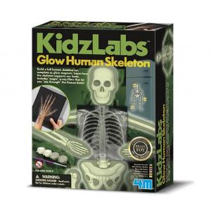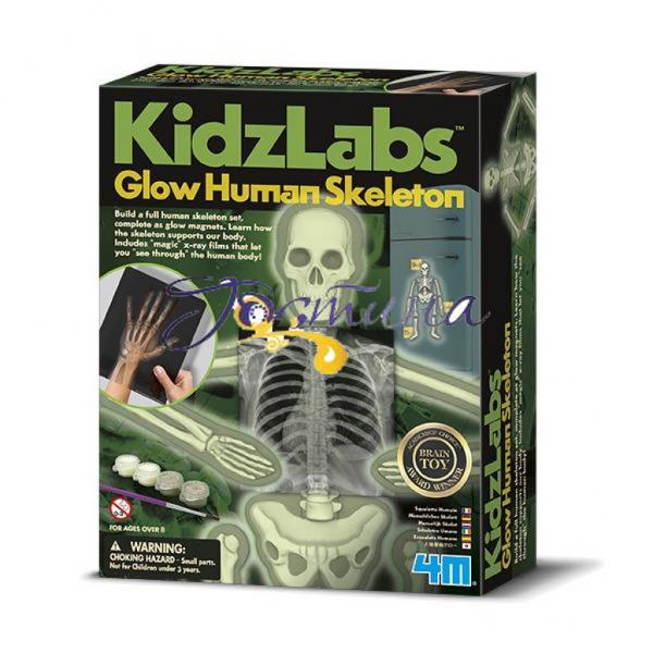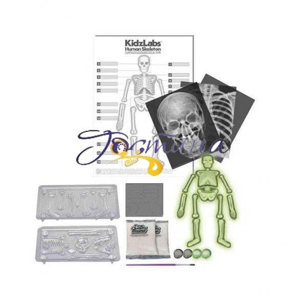 Набір для створення скелета людини, що світиться у темряві. У комплекті: форми для лиття, магніти, пакетики з гіпсом, фарби зі ефектом світіння, пензлик, макети рентгенівських знімків, інструкція. З цим набором дитина дізнається, як скелет підтримує тіло людини, і змайструє магніти, що світяться.