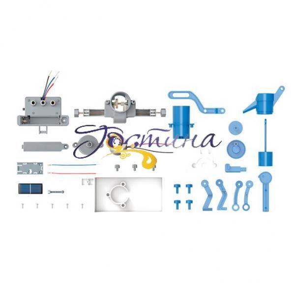 Коробка передач, акумуляторний модуль, верхня частина циліндра, поршневий з'єднувач, основа насоса, головна рама, шарнір сонячної панелі, поршень, основа циліндра, середній циліндр, циліндричний з'єднувач, штифти, мале зубчасте з'єднання, руки фігурки, ноги фігурки, з'єднувач фігурки, корпус і голова фігурки, велике зубчасте з'єднання, основа панелі сонячних батарей, панель сонячних батарей, кришка батарейного відсіку, кришка двигуна, обличчя фігурки, двигун, дроти для сонячних батарей, клемні кришки, маленьки гвинти. Також потрібно (немає в комплекті): маленька хрестова викрутка і одна батарея ААА.
