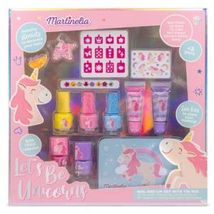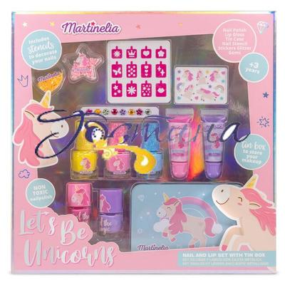 Набір для маникюра Martinelia Unicorn стане відмінним подарунком для дівчинки, яка мріє навчитися робити трендовий манікюр. Набір дитячої косметики компактно розташовується в кейсі, де кожен елемент має власне місце. Комплект косметичного набору: 3 мерехтливих лаки для нігтів; 2 лаки для нігтів; 2 блиски для губ; 2 дизайни для нігтів; наклейки єдиноріг; наклейки дорогоцінні камені; трафарети; кейс для зберігання. Рекомендовано для дітей від 5-ти років.