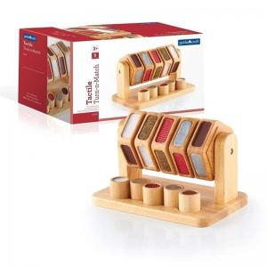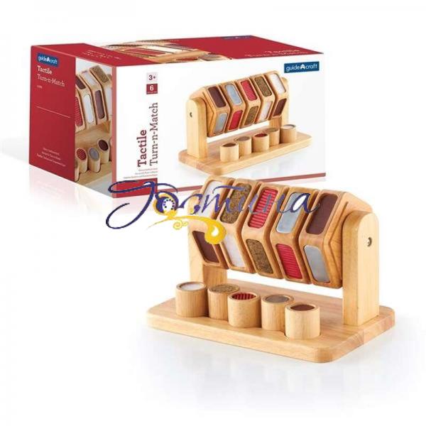 Гра в розвитку тактильних почуттів. П'ять п'ятикутних фігур обертаються на нерухомому стрижні, показуючи різний тактильний матеріал з кожного боку. Можна шукати збіги панелей на дотик ліворуч або змішувати їх, а також грати з фактурними циліндрами. Гра посилює тактильне сприйняття, вміння концентруватися і спільно грати. Можна змішувати і поєднувати текстури, що обертаються, з фактурними циліндрами. У наборі 5 циліндрів і блок, що обертається, з різними текстурами. тканина, лак, наждачний папір та піна EVA. Розвиток: сенсорні навички, координація рук та очей, тактильне сприйняття, вміння концентруватися