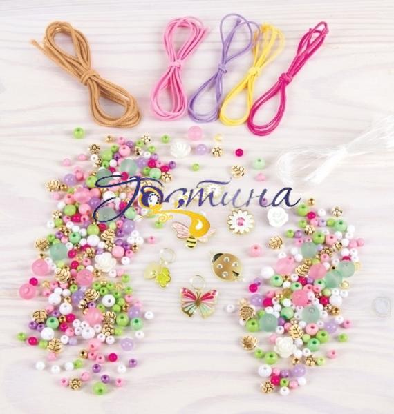 У наборі більше 440 різних намистин, 6 намистин з кристалами Сваровскі, прозорий еластичний шнур 6м, 5 вощених стрічок 4,5м, інструкція. Вам знадобляться: ножиці, клей, скотч