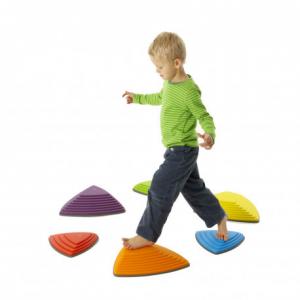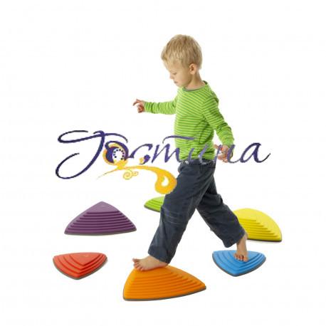 У наборі передбачено відразу 6 блоків. Кожен блок зроблений із синтетичної гуми в формі трикутника і має свій, відмінний від інших, кольором, висотою і розміром: 3 маленьких і 3 великих. Під час заняття їх розташування з легкістю можна самостійно контролювати, щоб зробити шлях більш-менш складним. Кожен камінь має неслизьку гумову поверхню, яка також знаходиться і на внутрішній стороні блоку, що перешкоджає подряпин і інших небажаних пошкоджень статі.