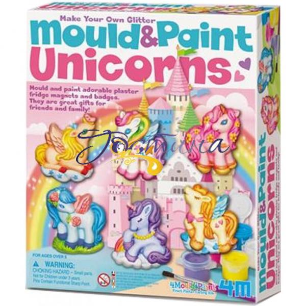 Набір для творчості «Єдинороги» пропонує зліпити фігурки з магнітами або значки у вигляді міфічних єдинорогів, використовуючи гіпс, форми і фарби.