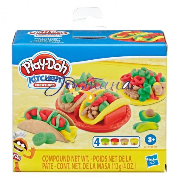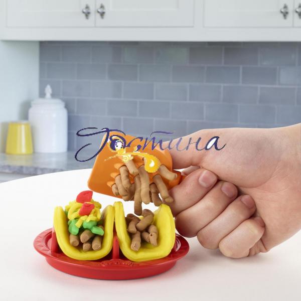 Тепер маленькі гурмани можуть вибирати, кулінарний шедевр створити сьогодні з маси для ліплення! За допомогою різних форм можна виліпити безліч начинок і прикрас для готових страв, а посуд в комплекті дозволить зробити неймовірну сервіровку. З цими наборами від Play-Doh вони зможуть перевтілитися у справжніх шеф-кухарів і приготувати апетитні тако або освіжаючі фруктові коктейлі. У кожному наборі є всі необхідні інструменти і баночки з масою для ліплення яскравих кольорів.