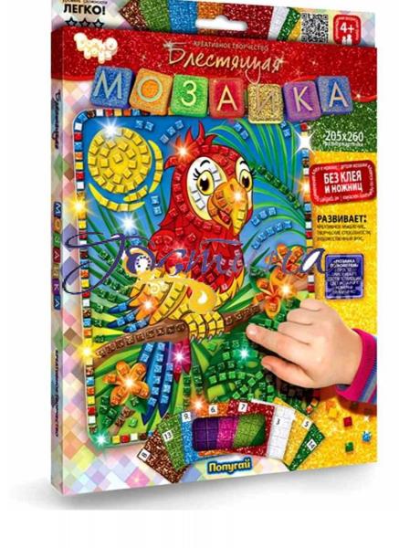 Набір для творчості "Блискуча мозаїка". Розвиває креативне мислення, творчі здібності, художній смак. Інструкція: 1) Беремо картинку і палетку з наклейками; 2) Підбираємо палетки з наклейками відповідно номерам, зазначеним на коробці; 3) Відокремлюємо кубики-наклейки від палеток і клеїмо їх на вказані номери картинки; 4) З решти наклейок оформляємо рамку до готової мозаїці. Без клею і ножиць.