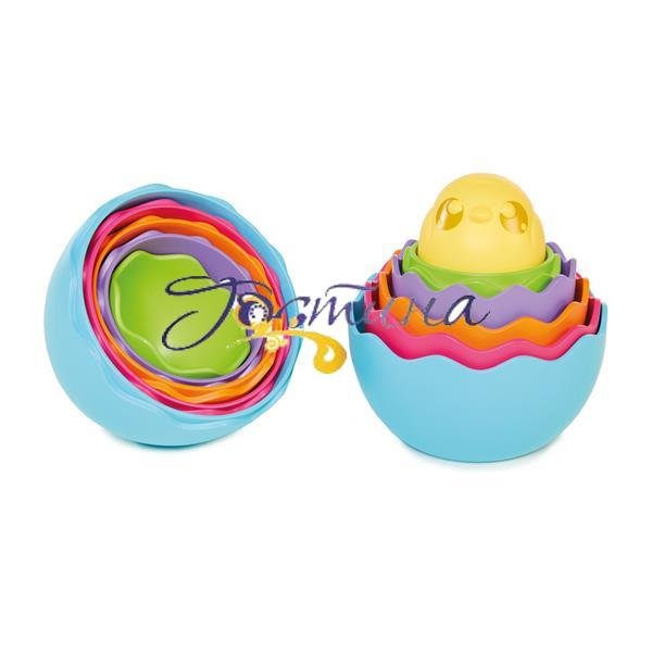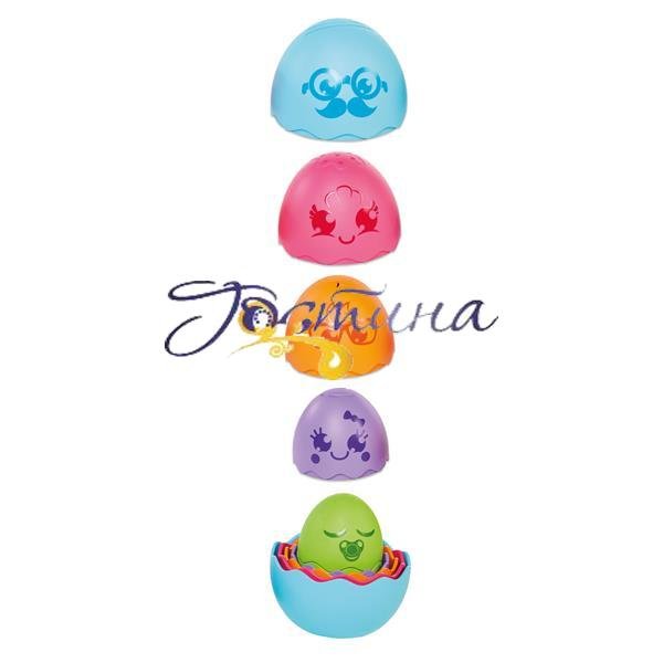 Дітям від 6 місяців сподобається збирати і розбирати половинки яєць, зачерпувати в них воду, поливати все навколо з фігурних отворів. У симпатичних обличчях вгадується сім'я: тато, мама, брат із сестрою і молодше курча. Для шкірного з родини можна придумати свою історію. Курча пищить, якщо натиснути на нього.