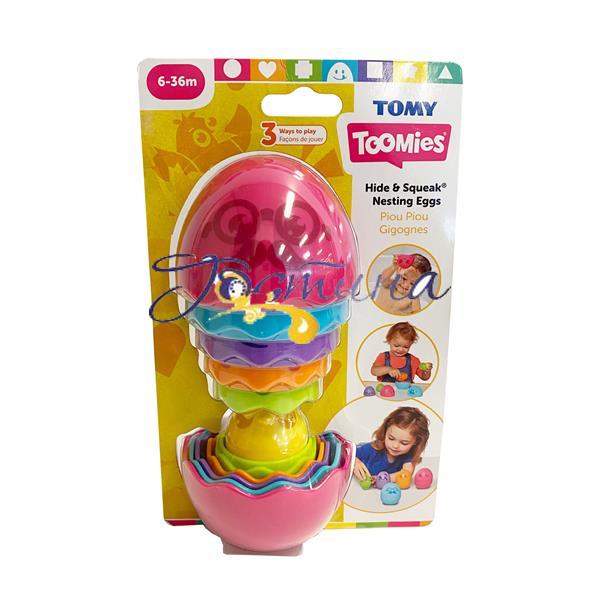 Набір іграшок для ванної Toomies Курча в шкаралупках складається з 5 яєць різних розмірів і кольорів: синій, помаранчевий, рожевий, зелений, фіолетовий. У кожному наборі ці кольори застосовуються до різних за розмірами яєчок варіативно.