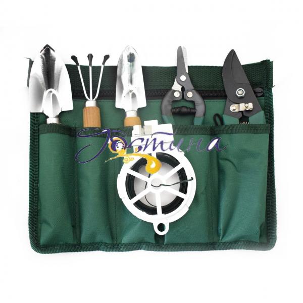 Професійний набір в який входить совок посадковий великий, совок посадковий маленький, культиватор, секатор, садові ножиці, дріт для підв'язки рослин на котушці і сумка для зберігання, застосовується для посадки і догляду за квітами, кімнатними рослинами у квітниках, горщиках, рокарії і клумбах.