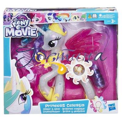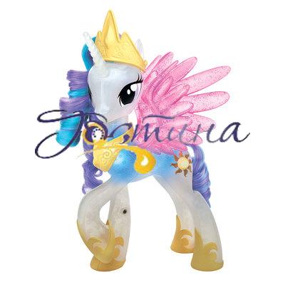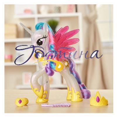 Принцеса Селестія керує чарівною країною Еквестрія, де мешкають твої улюблені поні. Ця прекрасна конячка має блискучі крила, котрі прикрашені різнокольоровими блискітками. Хочеш побачити, як Селестія засяє? Просто натисни на "к'юті марку" ‒ і ти побачиш справжнє диво. Завдяки довгій гриві, яку має поні, ти зможеш вигадувати різні зачіски або просто розчісувати волосся конячці.