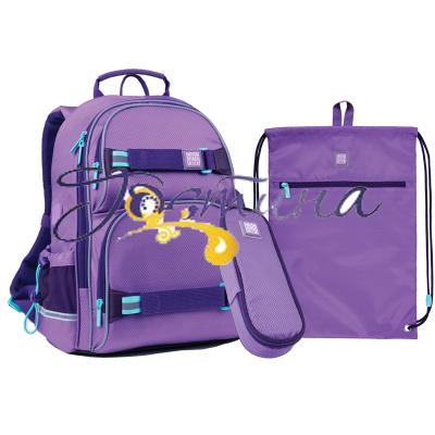 Рюкзак: ортопедична спинка Ergo Back, знімні нагрудний та поясний ремені, 1 відділення, 2 передні та 2 бічні кишені, кишеня для телефона, кишеня для планшета, внутрішні розділювачі для підручників, органайзер, ключниця, розклад, поле для персональних даних, прогумована ручка, ручка-петля, посилене дно, надійні замки та фурнітура, світловідбиваючі елементи, кріплення для пенні борду. Пенал: 1 відділення, органайзер. Сумка для взуття: 1 відділення, 1 передня кишеня.