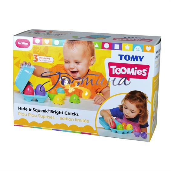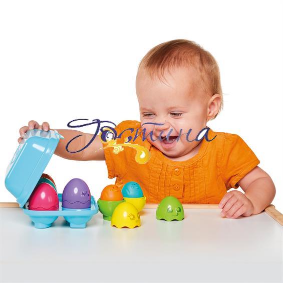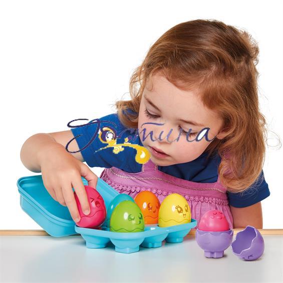 На яйцях зображені мордочки з різними емоціями. У наборі-сортер Toomies є яйце, яке посміхається, спить, боїться, сумує, хмуриться та облизується. Для кожного з них у лотку є отвір унікальної форми. Тому головне завдання дитини – підібрати відповідне місце для всіх героїв.