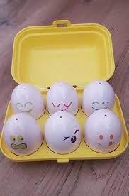 Розвивальна іграшка Яскраві яйця з ложечками навчить малюка сортувати предмети, а також розпізнавати геометричні фігури, кольори й емоції. Для кожного яєчка передбачений отвір унікальної форми, за яким дитині потрібно підібрати відповідне місце для встановлення фігурки в ложечці. Водночас колір ложечки має збігатися з кольором яйця.