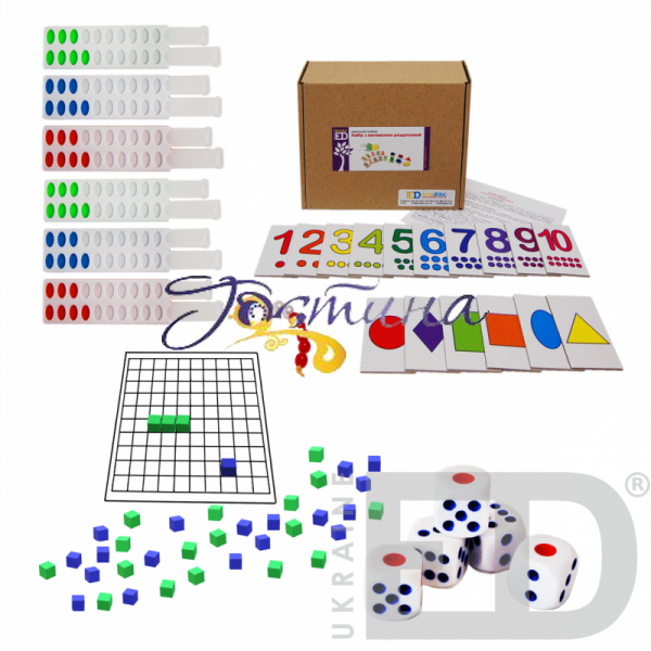 - Математична сітка - 4од. Являє собою набір кубів зі сторонами 1х1см. та планшетку в клітинку з розміткою 1х1см. Виготовлену з цупкого картону або пластику. Кількість кубів - 10 (5 одного кольору і 5 іншого).