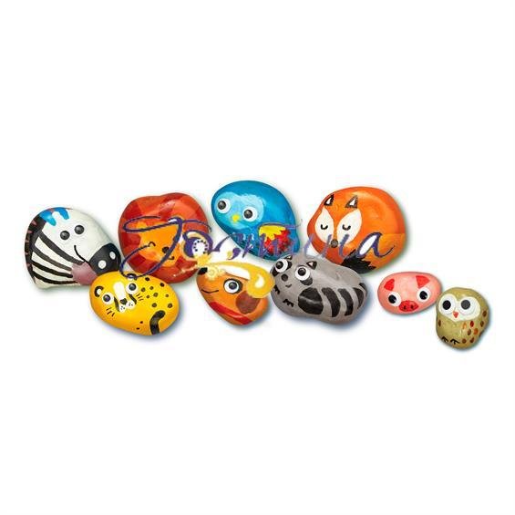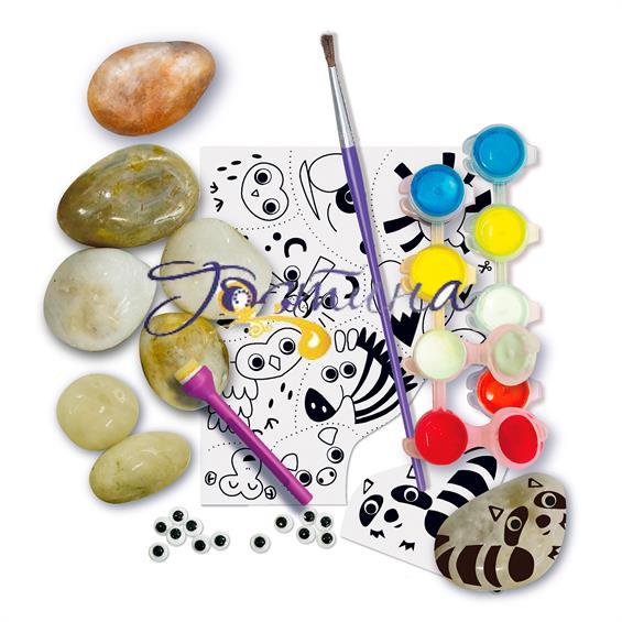 У наборі: 8 натуральних каменів різних розмірів, фарби, 1 пензлик для малювання, 1 лист з переносними картинками, 13 пластикових кружечків для очей, 1 паличка для склеювання і докладна інструкція.
