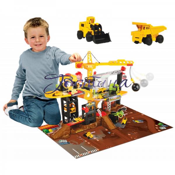 На будівельному майданчику завжди щось відбувається цікаве. Ігровий набір «Будівництво» дасть тобі можливість побудувати щось своє, для цього на майданчику є все необхідне. Потрібно звільнити місце для будівництва нової будівлі? Знеси стару! Це легко зробити, адже у тебе є баштовий кран обертається навколо себе, з руйнівною кулею. Тепер все чисто.Можна починати будівництво, а допоможуть тобі машини будівельної техніки: самоскид, трактор, екскаватор, всі машини з функцією вільного ходу коліс.Твої помічники на колесах піднімаються на верхні поверхи майданчику ліфтом або ручним підйомником. Прибувши на необхідну позицію машина стає під спеціальні пристрої для заповнення кузова.Вся будівельна суєта супроводжується звуковими і світловими ефектами. Будівельний майданчик комплектується килимом для захисту ігрової поверхні. Килим виконаний в дизайні будівельного майданчика.Ефекти (звукові, світлові): звукові, світлові.Харчування :: з батарейками 2 х 1,5V- R03.