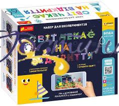 Легенди кажуть, що існує таємничий світ, де винаходи чекають, коли їх відкриють. Сучасники припускають, що портали в цей вимір знаходяться в наборах «МИР ЧЕКАЄ ВІДКРИТТЯ». Приєднуйся до наукових експериментів і дізнавайся, як винахідники вчаться у Природи. За допомогою спеціального безкоштовного додатку, яке необхідно встановити на телефоні або планшеті, зображення оживає прямо з коробки. Допомагай улюбленим героям долати труднощі в іграх з доповненою реальністю. Збирай 4 картки з різних наборів і починай Велику Гру справжніх дослідників! В Світі місце саме для твого винаходу! В наборе рассказывается об изобретениях: Холодильник Водопровод лавовые лампы Термос Фен Лодка. Проведи опыты: ? Что нам поможет изменить состояние воды? Как перелить воду без рук? жидкие вещества смешиваются? Как смешиваются теплые и холодные потоки в реке? Как лучше сушить одежду? что может утонуть в воде? Комплектація: стаканчики, гуаш, пензлик, пластилін, прозора трубочка, нитка, пляшка з кришечкою, шипуча таблетка, масло, харчовий барвник (синій і червоний), картонна картка, ложка, чашка Петрі, тканину, пробки, губки, дерев'яна паличка (коротка ), вітрило, форма для льоду, блискітки, покрокова інструкція.