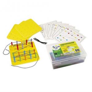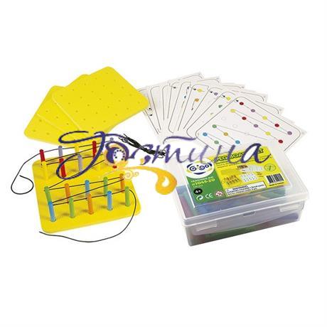 Набір сприяє розвитку у дитини дрібної моторики, пам'яті, уваги, логіки, вмінню порівнювати, працювати за схемою, орієнтуватися на площині, переносити на схему свої власні проекти; вмінню добиватися результату і доводити почату справу до кінця. Набір включає: 4 дошки з отворами; 120 стрижнів 6-ти кольорів; 4 шнура; 16 карт.