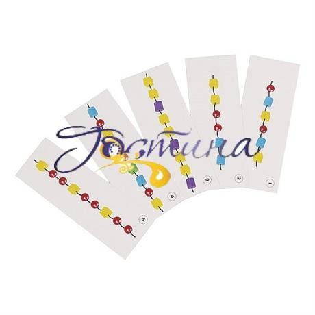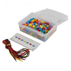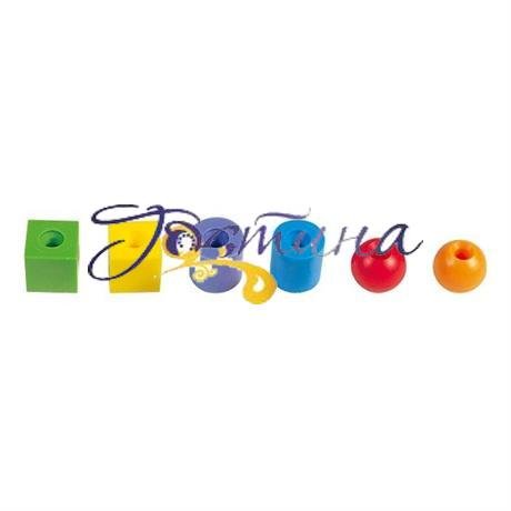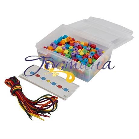 Набір складається з 300 намистин шести кольорів і трьох різних форм, 6 шнурків для нанизування намистин, 10 карток з прикладами. Для малюків ця іграшка стане відмінним тренажером для розвитку посидючості та уваги. Ігри зі шнуруванням зміцнюють кисті, розвивають координацію рук і очей. Комплект можна використовувати і для навчання рахунку. Набір дає уявлення про такі поняття, як форми, кольору, підрахунок, порядок, сортування.Продукція має свідоцтво про відповідність педагогічним вимогам МОН України.