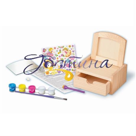 Створіть свою власну казкову скринька! Цей набір для творчості допоможе дівчинці відчути себе дизайнером: вона розфарбує скриньку в улюблені кольори, прикрасивши перекладними картинками. Там вона зможе зберігати намисто, кільця, каблучки і всі важливі дрібниці.Створіть атмосферу творчої майстерні. Для початку надіньте фартух, щоб випадково не забруднитися в фарбі. Потім дайте дитині визначитися з кольорами, в які вона хоче розфарбувати шкатулку. У цей момент вона стане справжнім художником: для отримання деяких відтінків необхідно змішувати кольори. Наприклад, щоб отримати рожевий, змішайте червоний і білий, для зеленого - жовтий і блакитний (не переживайте, все необхідні формули ви знайдете в інструкції). Або просто дайте волю фантазії!Дайте поверхні висохнути і відкрийте двері справжньої магії - декору за допомогою чарівних картинок. Не поспішайте знімати прозору плівку: нехай дитина виріже вподобану картинку і зрозуміє, де хоче її приклеїти. Після цього зніміть прозору плівку і помістіть картинку зображенням вниз на панель шкатулки, нанесіть за допомогою палички для наклеювання трохи води і залиште на 30 секунд. Готово! Акуратно зніміть білий папір, а картинка залишиться на скриньці.  Магія? Ще б! Розвиваючі іграшки не повинні бути складними, вони повинні бути чарівними.Тепер залишився фінальний штрих. Яка шкатулка обійдеться без дзеркала? Покажіть дитині, як приклеїти його за допомогою двосторонньої клейкої стрічки.Набір із серії Generic Crafts допоможе дітям відкрити в собі художній талант. Він стане справжнім скарбом для дівчинки. До того ж, він розвиває в фантазію, дрібну моторику і колірне сприйняття. Дерев'яна скриня (12 х 9 х 13 см) - 1 шт.Дзеркало - 1 шт.Лист з перекладними картинками - 1 шт.Подвійна клейка стрічка - 1 шт.Набір фарб - 1 шт.Кисть - 1 шт.Паличка для наклеювання - 1 шт.Інструкція - 1 шт.