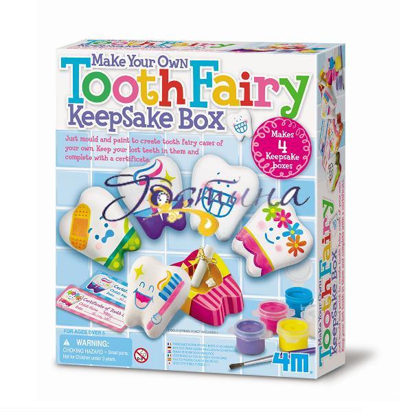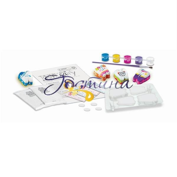 Набір для творчості «Шкатулка зубної феї» (00-04564) від «4M» пропонує виліпити заготовки для шкатулок у вигляді зуба з гіпсу і нанести на них імпровізований малюнок, використовуючи фарби. Схоже, що ці скриньки знадобляться для зубної феї. Набір збирається під контролем дорослих. Включайте фантазію і за роботу! Вік: 5 +. Комплектація: пакетик гіпсового порошку (3 шт.), 24 форми для лиття, магніти (3 смужки), фарби (15 шт.), Пензлики (2 шт.), Детальна інструкція. Додатково будуть потрібні: ємність для змішування і ножиці. Розміри упаковки: 18,2х21,3х5 см.
