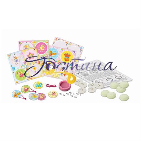 Набір дозволяє створити 12 гудзиків-значків,що світяться в темряві. Це прекрасна прикраса і подарунок.Комплектація: пластикові заготовки для створення 12 гудзиків, 3 шаблони з 12 круглими вставками з картинками, 1 шаблон з 4 порожніми вставками для своїх малюнків, термозбіжна плівка, 8 шпильок, 4 гумки, інструкція.За інструкцією: відокремте заготовки від шаблонів, вставте їх в круглі основи з термоусадочної плівкою, накрийте пластиковим низом. Далі нагрійте феном для фіксації. Прикріпіть шпильки для створення брошок або гумки, щоб отримати аксесуари для волосся.Брошками можна прикрашати одяг, сумки, рюкзаки. Вироби світяться в темряві. Падалка стануть відмінним подарунком рідним і друзям.Комплект дає можливість дітям відчути впевненість у своїх здібностях і радість від створення декоративних предметів власноруч з невеликою допомогою батьків. Набір для творчості розвиває: дрібну моторику, творчі здібності, емоційне благополуччя, уяву.Для дітей від 5 років, використовувати під наглядом дорослих. Добре підійде дівчаткам.