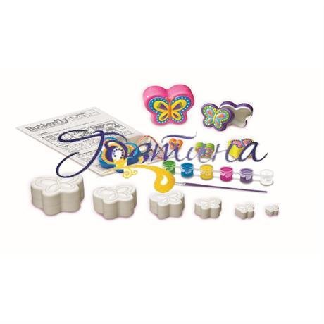 Розмалюйте 6 коробочок для дрібних предметів в формі метеликів. Їх можна складати одна в іншу.Набір для творчості «Шкатулки-метелики» пропонує розфарбувати 6 коробочок різного розміру у формі метеликів, використовуючи фарби. У цих шкатулочках маля зможе зберігати свої прикраси і секрети!  Комплектація: коробочки (6 шт.),  фарби (6 шт.), кисть,  детальна інструкція.