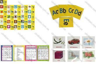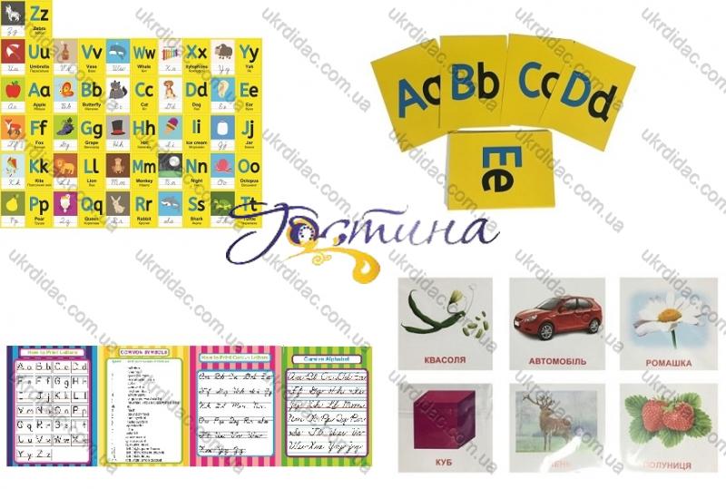 Набір наочно-дидактичних матеріалів з іноземних мов (англійська мова) використовується в якості демонстраційного матеріалу під час вивчення іноземної мови в початкових класах і дитячих садках. Технічні характеристики  - Абетка для використання вчителем, що містить набір карток, на яких надруковано великі літери абетки. Формат карток не менше А5. Матеріал - цупкий картон. - 26 шт.- Абетка роздаткова для використання учнями - 15шт. Друковані великі та малі букви абетки, зразки каліграфічного письма. Формат карток не менше А8.Матеріал - цупкий картон. - 390 шт. - Картки 'Прописи', 'Як писати прописи', 'Як писати друковані літери', 'Знаки в англійській мові' - 4шт. - Картки для вивчення слів (тематичні) - 6 компл. - Контейнер з кришкою для зберігання набору.