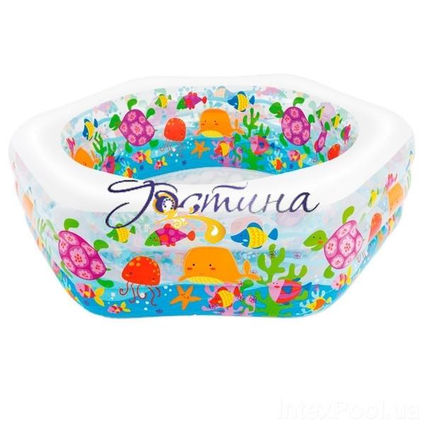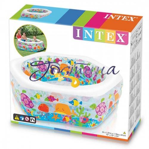 Великий надувний басейн INTEX "Акваріум" стане улюбленим місцем для всієї родини в спекотну літню погоду. Має яскраву і цікаву розмальовку, що нагадує морське дно з безліччю барвистих мешканців. Він буде добре виглядати як на задньому дворі вашого приватного будинку, так і в саду, а завдяки великому обсягу в 510л в ньому помістяться декілька дітлахів. Модель має шестикутну форму і міцне надувне дно, до того ж для зручності користування та легкої заміни води в ньому передбачений ще і зливний клапан.