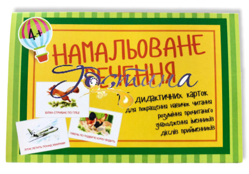 25 дидактичних карткок з малюнком та підписом простого речення для поліпшення навиків читання, розуміння іменників, дієслів та прийменників стосовно малюнка.