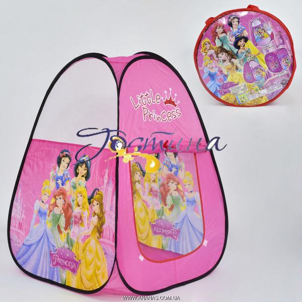 Кожна дитина мріє про свій затишний куточок, де можна сховатися від усіх і пограти з улюбленою іграшкою, почитати книжку або просто посидіти і помріяти про щось. Саме для таких цілей і служить ігрова палатка «Принцеси Дісней». Трикутний намет з віконцем можна встановити у себе у дворі, взяти з собою на пляж або грати з нею вдома. Зібраний виріб являє собою легкий і невеликий круглий пакетик і не займе багато місця. Збирати намет досить легко, тому з установкою може впоратися навіть дитина. Розмір упаковки: 72 см * 72 см * 92 см Упаковка: ПВХ сумка