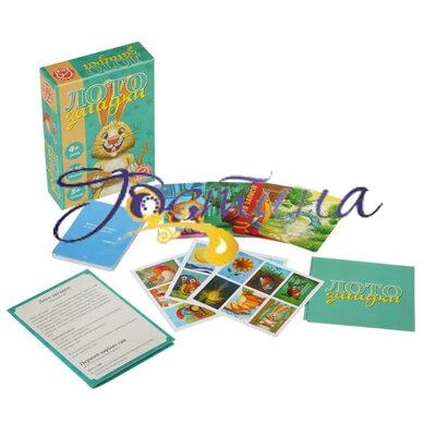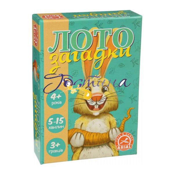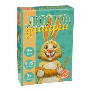 Варіант класичної гри «Лото» для кмітливих дітей. Особливістю цієї гри є те, що треба не шукати цифри, або зображення, а відгадувати загадки. У комплекті гри 25 двосторонніх карток - з одного боку текст загадки, з іншого малюнок-відповідь. На плашках у гравців знаходяться тільки високохудожні авторські малюнки. Накриває відповідний малюнок той, хто першим розгадав загадку. Для дітей від 4-х років.