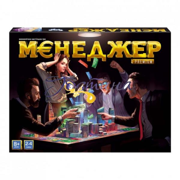 Захоплююча настільна гра Менеджер Premium, яка припаде до смаку не тільки дітям, а й дорослим. Відмінна альтернатива всім відомої Монополії зі своїми унікальними відмінностями. За допомогою цієї гри учасники навчаться виявляти свій економічний талант та ділову активність. По периметру ігрового поля розставляються 8 різнокольорових підприємств, кожне з яких складається з трьох філій. Кожній філії відповідає акція із зазначенням її вартості. Серед гравців вибирається банкір та директор страхової компанії. Після цього гравці ставлять свої фішки на старт і шляхом жеребкування визначають черговість ходів. Коли фішка потрапляє на вільну філію, гравець може купити її, забравши при цьому акцію з лотка, а на місце поставити фішку власності свого кольору. Гра триває, поки всі гравці крім одного не збанкрутуют
