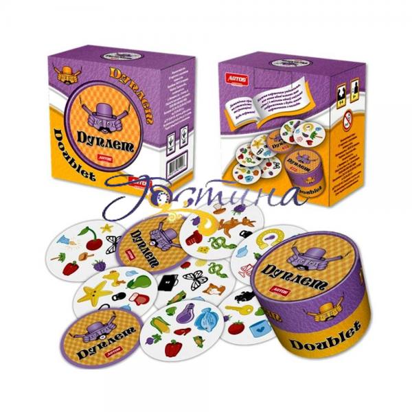 «Дуплет» - весела динамічна гра, що розвиває зорове сприйняття, увагу та концентрацію. Ця гра чудово підійде як діткам, так і дорослим. Для гри використовується колода з 57 круглих карточок з безліччю зображень. Кожна карточка унікальна. На ній розміщені 8 картинок, але тільки одна з них співпадає з зображенням на будь-якій іншій карточці з колоди.
