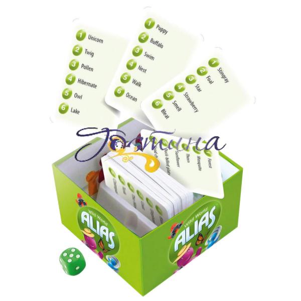 Комплект: кубик, 100 карток (на кожній 6 слів), 6 фішок, інструкція;