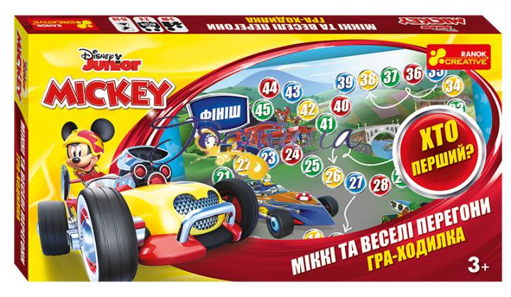 Міккі та його друзі подорожують світом та беруть участь у перегонах. Сьогодні вони запрошують і вас приєднатися до них. Хто ж першим прийде до фінішу? Уперед, до перемоги! Склад гри: ігрове поле, 4 фішки, 1 кубик. Кількість гравців: 2-4 особи. Час однієї гри: 15-20 хв. Вік гравців: 3-99 років.