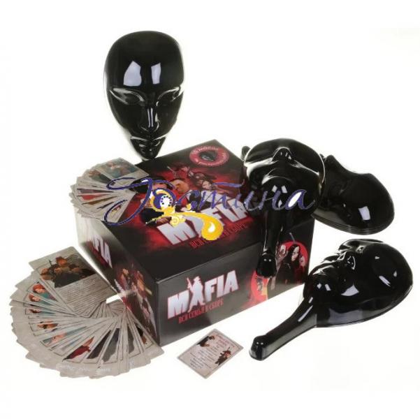 У комплект входять: 10 пластикових масок, 21 картка для ведучого, 30 карт ролей і правила гри.