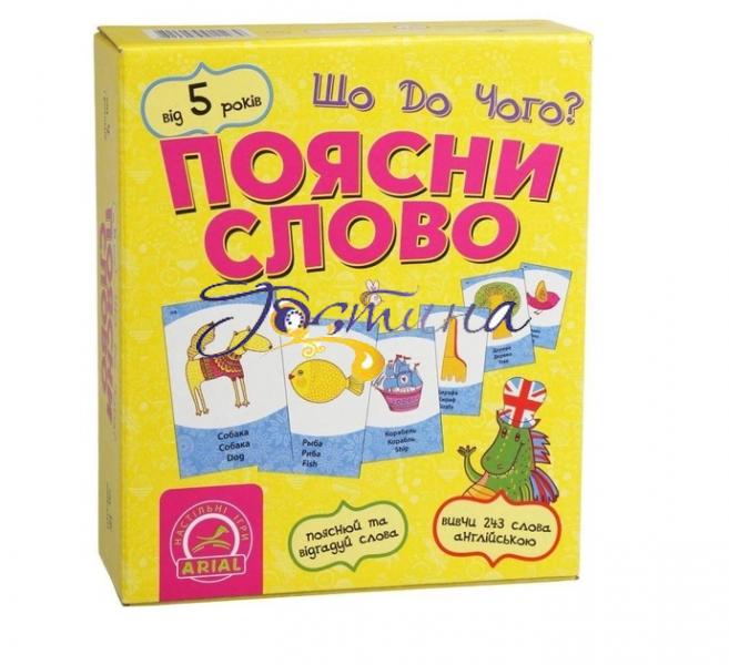 Варіант гри «Поясни слово. Що до чого?» для наймолодших. Суть гри проста — потрібно назвати малюнки зображені на картках. На кожній картці є тільки один малюнок і відповідне слово на трьох мовах (українській, російській, англійській). Гра допоможе не тільки цікаво провести час, але й вивчити 243 слова на англійській мові.