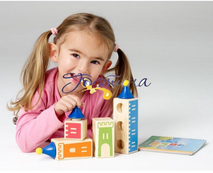 У комплекті: - буклет із завданнями та розв'язками — 7 дерев'яних деталей для будівництва замку