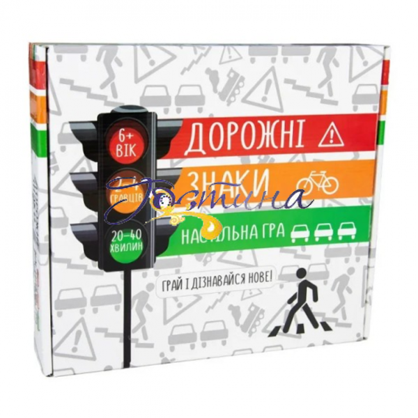 Дорожні знаки» гра для дітей віком від 6 років, яка передбачає вивчення основних дорожніх знаків, з якими пішохід може зіткнутися у житті. Наприклад: «Пішохідний перехід», «Доріжка для велосипедистів», «Зупинка автобуса» тощо. У комплекті «Дорожні знаки» Strateg (30245) є велике поле, яким гравцям потрібно переміщати свої фішки, і кубик, а мета гри – дійти до фінішу, дотримуючись правил дорожнього руху. Також у комплекті 55 карток з питаннями та варіантами відповіді, за допомогою яких діти поступово запам'ятовують важливу інформацію.