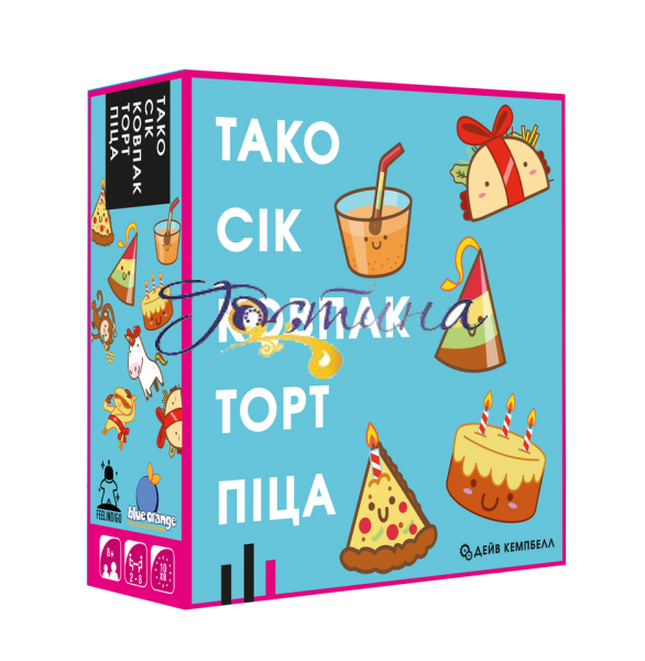 "Тако Сік Ковпак Торт Піца" - нова гра із серії ігор "Тако Кіт Коза Сир Піца", яка відразу ж привертає до себе увагу своєю вибуховою атмосферою та новими правилами. Ця гра забезпечує заряд позитиву та веселощів для гравців будь-якого віку. "Тако, сік, ковпак, торт, піца" - ці 5 слів запам'ятовуються з легкістю, і саме вони стали основою для правил гри.