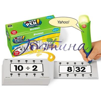 Хороший спосіб вивчити ділення в ігровій формі. Діти вибирають картку, читають питання і вибирають правильну відповідь. Потрібно торкнуться обраної відповіді спеціальною ручкою, і ручка скаже їм - праві вони чи ні. У наборі 53 двосторонніх карти і ключ відповідь.